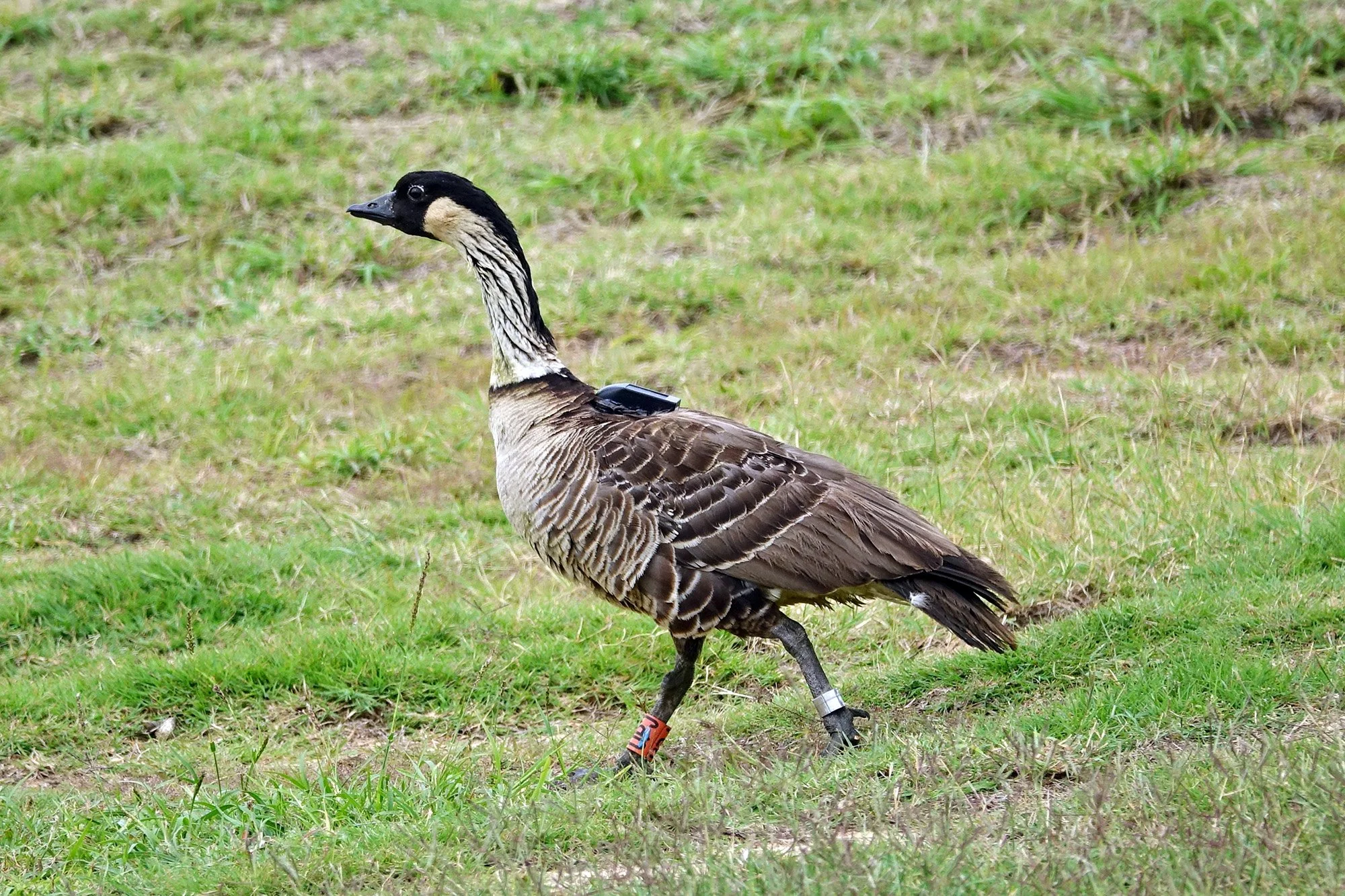 In January, we attached GPS Data Loggers onto 6 male nēnē. They are a black, lightweight device that is attached with a backpack-style harness. The tags use cell towers to log a location every minute, which will provide us fine-scale movement data to better inform us of their habitat preferences.